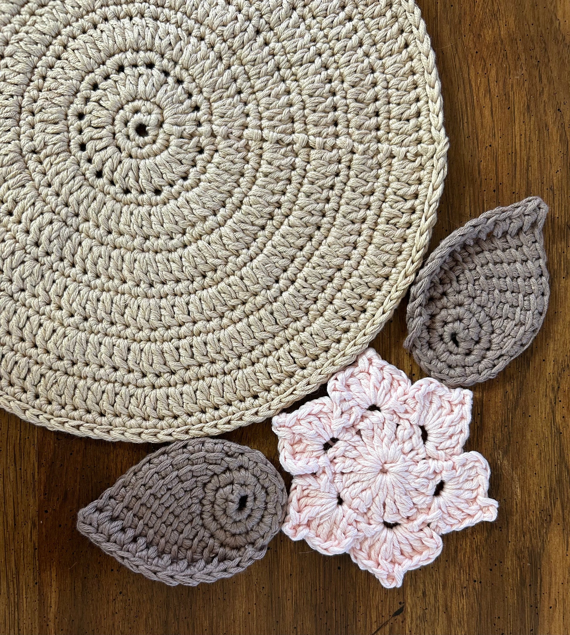 Crocheted placemats, made with a 50% cotton/50% bamboo yarn. Placemats measure approximately 12” in diameter, 15” to the edge of the flower. Choose from light or dark placemats, with three flower color options. $60/each, or a set of 4/$200. Add 4 to your cart of any color option, and the 4th will be automatically discounted at checkout.