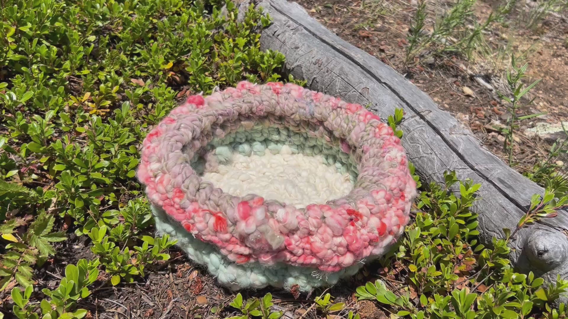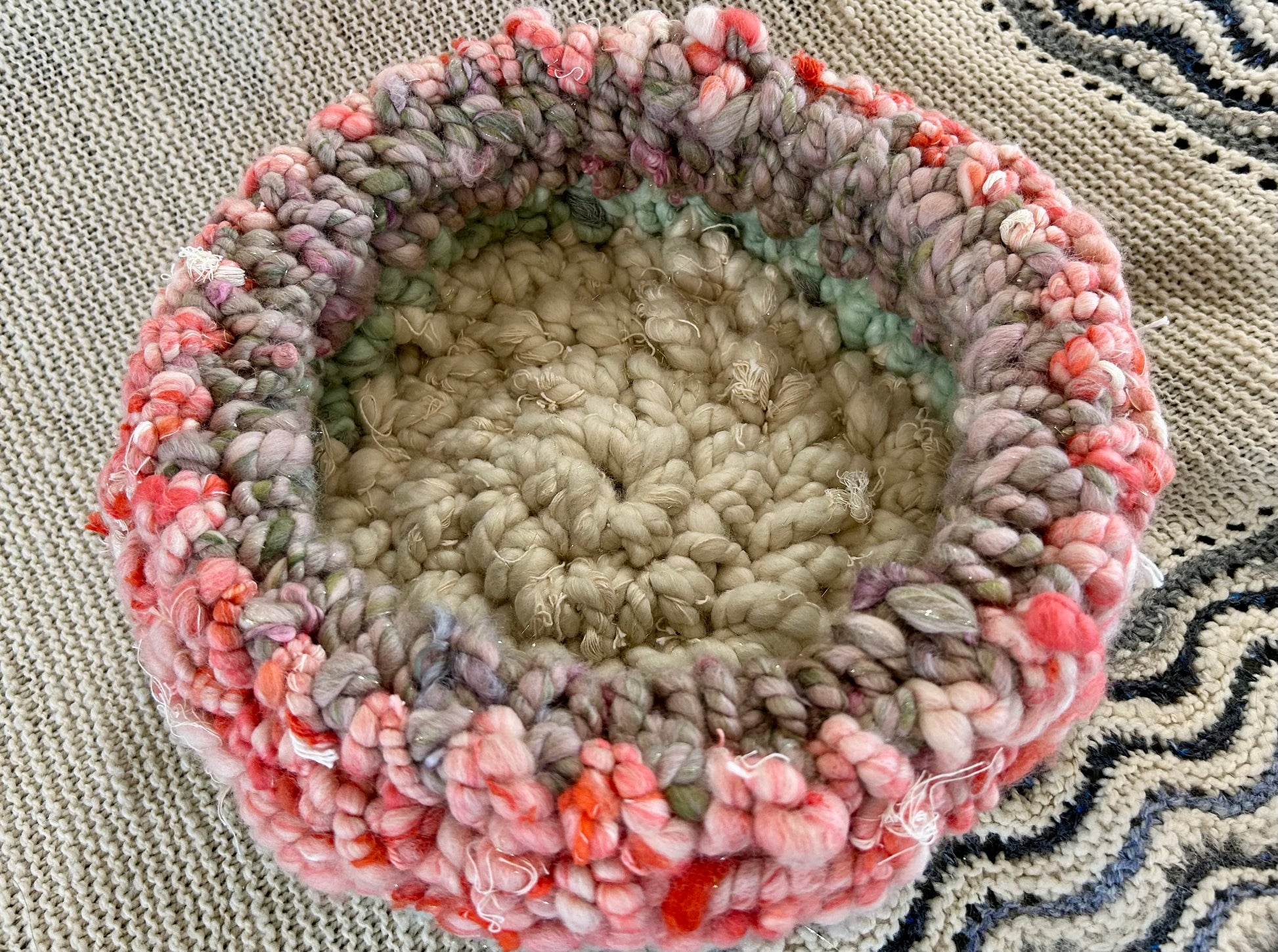 These baskets are hand crocheted using chunky art yarn from The Woven Hand. They are soft, durable, come in a variety of colors, and also make great small pet beds!